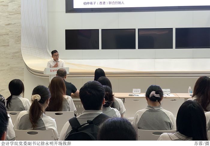授牌仪式后,师生和企业嘉宾开展专题讲座。3044永利集团官网党委副书记徐永明作开场致辞,他表示此次活动是深化产教融合、拓宽学生视野的重要实践,希望同学们能够用心学习思考,将所见所闻转化为自身成长动能,为未来职业发展锚定清晰坐标。随后,伯仲電子(香港)联合创始人刘博、展睿投资咨询(深圳)有限公司财务总监梁雪萍、财务经理王晓庆三位企业嘉宾紧扣“择业、突破、成长”的主题,分享了各自的职业成长之路及创业历程,希望同学们能够树立长期发展观,以积极健康的心态面对初入职场的挑战,在实践锻炼中培养解决问题的韧性、持续学习的习惯以及高效协作的能力。最后的互动问答环节,学生们围绕职业困惑、技能提升、行业前景等热点问题与嘉宾进行了深入交流,有效解答了诸多职业发展中的疑问。