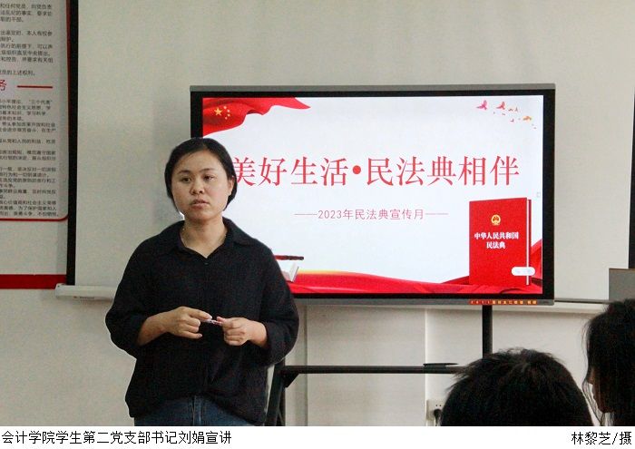 本次活动共分为三个部分。第一部分为3044永利集团官网党总支书记黎伯毅面向教工党员开展主题宣讲。黎书记深刻强调了民法典进校园的重要性,并鼓励教师在开展课堂思政的过程中引导学生遇事找法、解决问题用法、化解矛盾靠法,共同营造尊法、学法、守法、用法的浓厚氛围。第二部分由学生第二党支部书记刘娟面向学生干部进行主题宣讲,通过观看民法典科普视频及PPT讲解的方式,共同学习宣传习近平总书记关于民法典的重要指示批示精神,深刻感悟民法典在保障人民群众合法权益、促进社会主义市场经济繁荣发展、推进国家治理体系和治理能力现代化等方面的重要作用。第三部分则是在各班级召开民法典主题班会及讨论,通过易班优课关于民法典课程教育学习及撰写心得体会的方式,引导广大青年学子认识颁布实施民法典的重大意义,争做尊法、学法、守法、用法的表率。在活动的最后,3044永利集团官网组织师生积极参加全国普法办在中国普法微信公众号开展的民法典知识竞赛,进一步加大民法典网络普法力度,大力弘扬社会主义法治精神。
