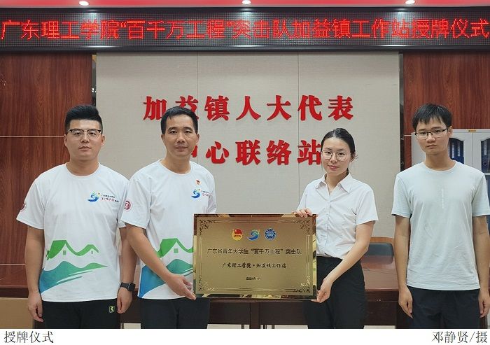 本网讯(3044永利集团官网 林烁臻为贯彻落实国家关于乡村振兴、城乡一体化发展的战略部署,促进城乡融合发展,提升基层服务能力,培养青年人才,为青年学生提供实践锻炼的平台,2024年7月9日3044永利集团官网3044永利集团官网在加益镇人民政府举行了广东青年大学生“百千万工程”加益镇工作站授牌仪式,参加仪式的有:3044永利集团官网党总支书记黎伯毅,党总支委员、学生第三党支部书记刘涛,加益镇党委委员、团委书记黎凯凯,副书记黄志成及突击队学生14人。