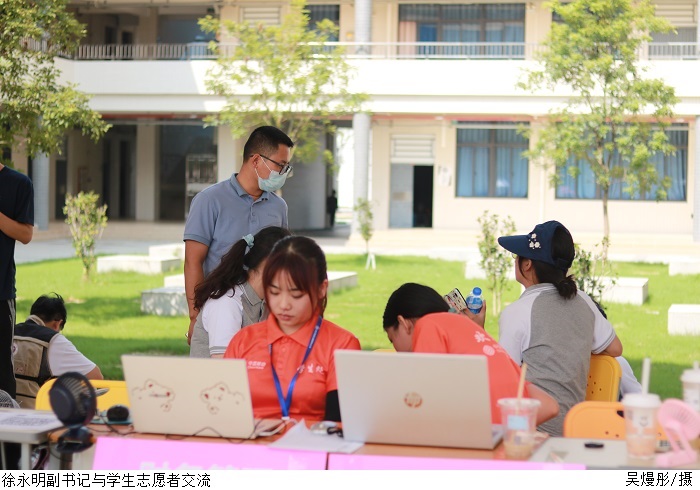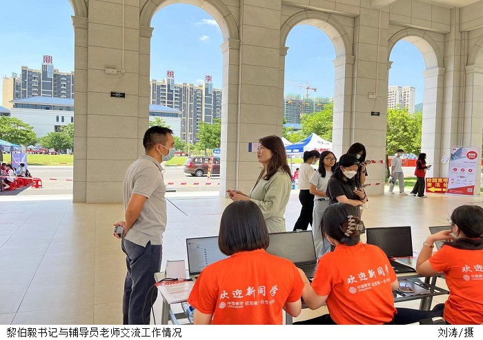 迎新当天,党总支书记黎伯毅、副书记徐永明仔细询问新生入学的信息核验、报到登记及宿舍安排等环节的情况,了解新生报到工作进展情况,耐心地为他们答疑解惑,并表示欢迎他们的到来。同时慰问了在迎新工作岗位上辛苦工作的辅导员和迎新志愿者,对大家的辛勤付出给予了高度肯定。