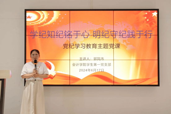 郭凤玮首先介绍了党中央在全党开展党纪学习教育的决策背景和重要意义,然后结合自身学习体会从学纪知纪铭于心、明纪守纪践于行”四个方面进一步阐述了如何好党纪学习教育。党中央对加强党纪学习教育高度重视,对全面推进制度治党、依规治党彰显出坚定的决心。她要求学生党员要深刻理解这一决策的重要性和紧迫性,以高度的政治责任感和使命感,积极参与到党纪学习教育中来。