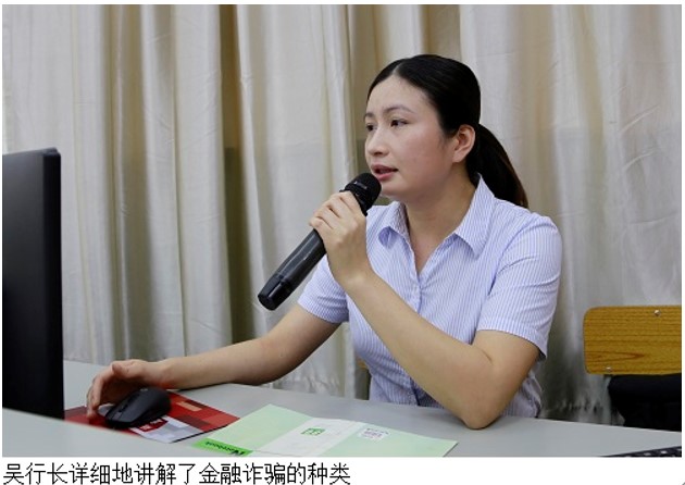 会上,吴行长对防范银行账户资金诈骗、辨明虚假信息和防范资金损失、防范集资诈骗、防范存款形式的诈骗这四方面进行了详细的讲解,使同学们清楚地了解到金融诈骗就在我们身边。随后,高要农商银行的职员为同学们分析了应如何辨别纸币的真假,并与现场同学进行小互动,调动了同学们的积极性,让同学们了解到如何辨别纸币真假及纸币的特点。