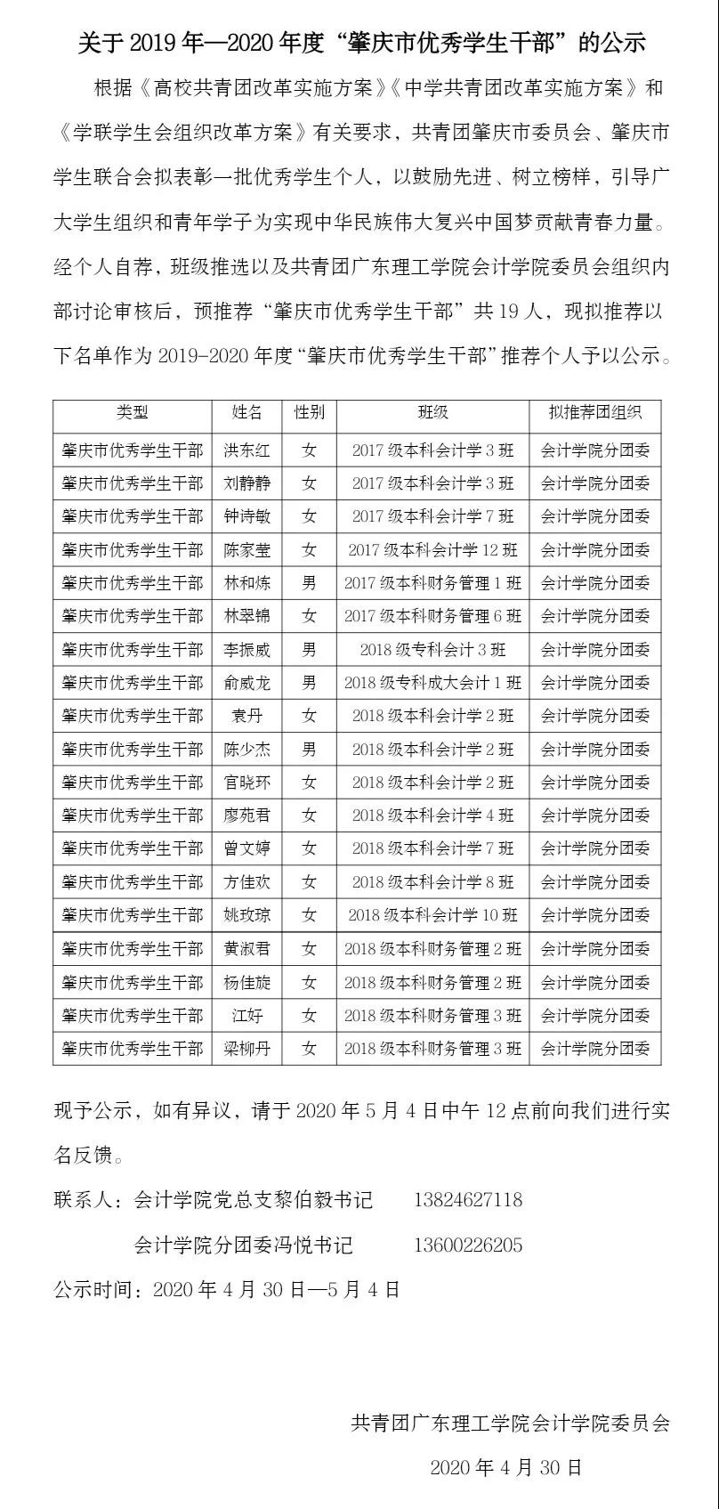 根据《高校共青团改革实施方案》《中学共青团改革实施方案》和学联学生会组织改革方案》有关要求,共青团肇庆市委员会、肇庆市学生联合会拟表彰一批优秀学生个人,以鼓励先进、树立榜样,引导广大学生组织和青年学子为实现中华民族伟大复兴中国梦贡献青春力量。经个人自荐,班级推选以及共青团3044永利集团官网3044永利集团官网委员会组织内部讨论审核后,预推荐“肇庆市优秀学生干部”共19人,现拟推荐以下名单作为2019-2020年度“肇庆市优秀学生千部”推荐个人于以公示。