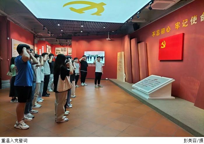 首先,在刘涛老师的带领下,同学们参观了“叶挺独立团团部旧址”纪念馆,观看历史照片、文物展示、雕塑、场景还原等,回顾了叶挺独立团从成立、发展壮大到担任北伐先锋、为新民主主义革命立下汗马功劳的历程,重温了革命先烈的峥嵘岁月。紧接着,党员同志们前往阅江楼“初心堂”,他们面向鲜红的党旗,高举右拳,在刘涛书记的领誓下重温入党誓词,在党旗下接受心灵的洗礼,发自肺腑的誓言鞭策着全体同志要时刻坚持初心使命,铭记入党的决心和信念。
